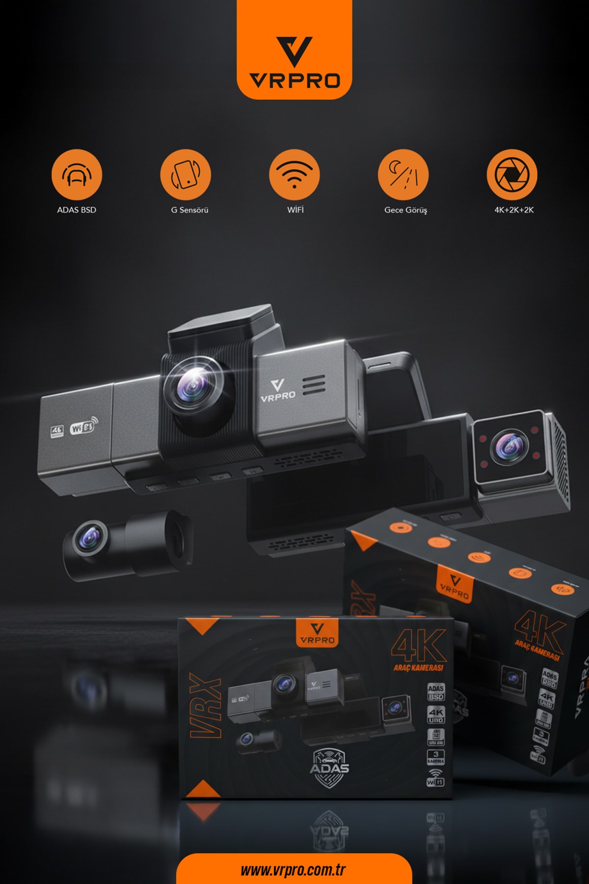 Gelişmiş VRPRO VRX, ön, iç ve arka kameralarıyla aracınızın her noktasını kayıt altına alır. 4K UHD görüntü kalitesi ve yapay zeka destekli sürüş asistanı (ADAS) ile güvenliğinizi şansa bırakmaz.